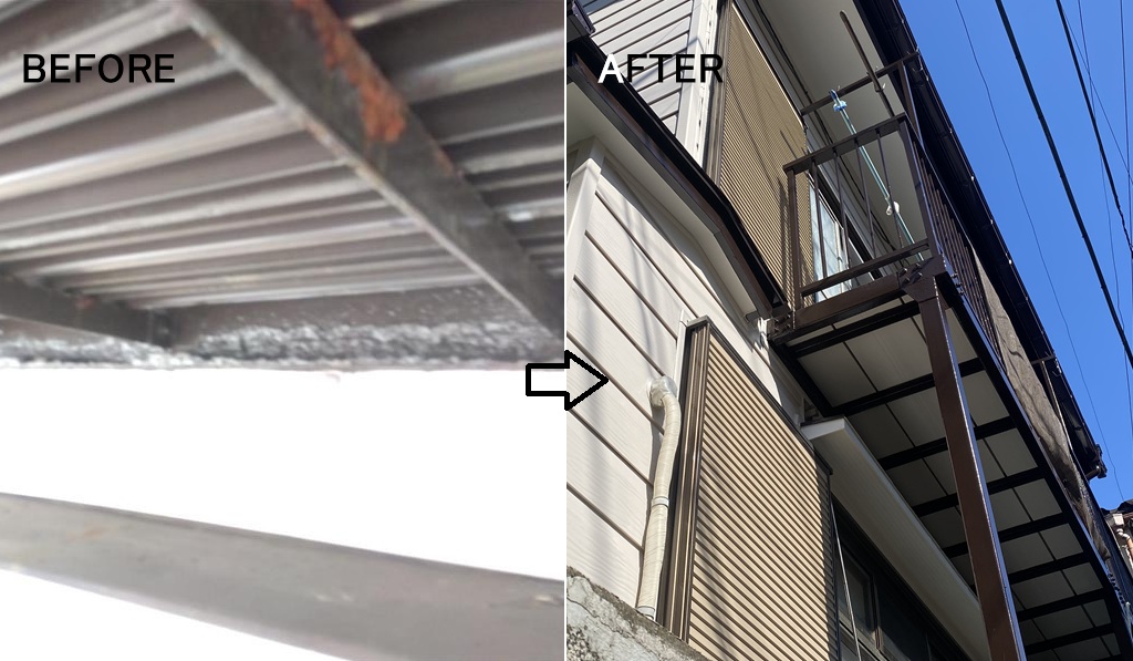 バルコニーの支柱は台座からズレているなど、危険な状態でした。