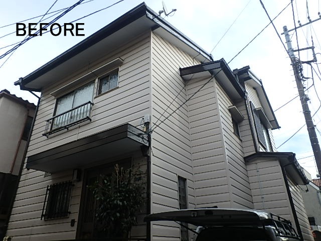 施工前は、外壁面を手で触れると、粉状の汚れが手に付着する状態でした。