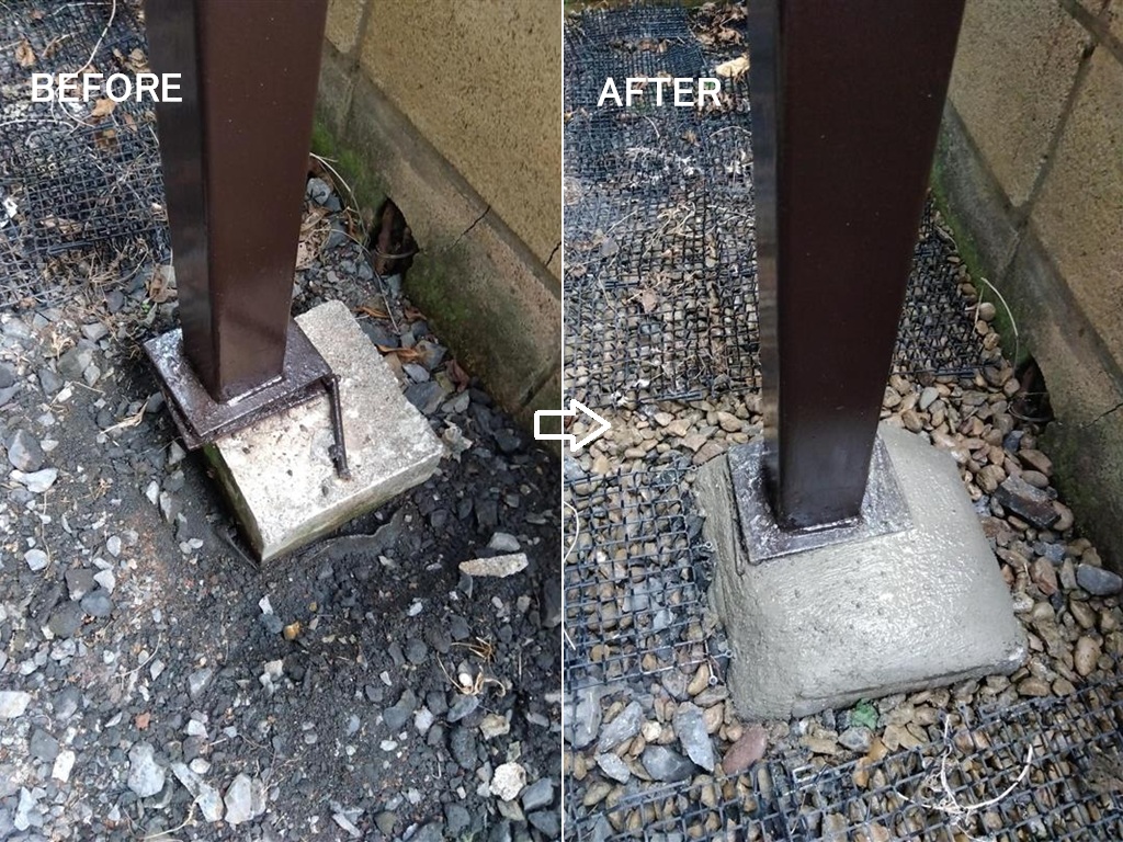 鉄部は溶接で補強、支柱の足部分はモルタルを打ち増しし、固定しました。